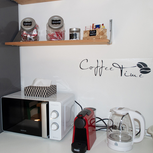 Il frigo può contenere comodamente cibi e surgelati nei suoi 250 litri di capacità; e per la colazione avete a disposizione un angolo dedicato, con la macchina per il caffé a cialde e un fornetto scalda brioches.